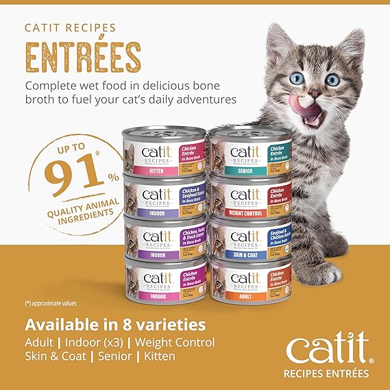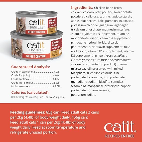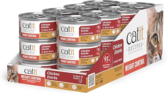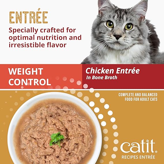 Catit Recipes Weight Control Chicken Entrée - Low-Fat, High-Protein Wet Cat Food, L-Carnitine, Prebiotics, Omega-3 for Skin & Coat, Hydrating Bone Broth, 100% Balanced Meal 3oz (24/cs)