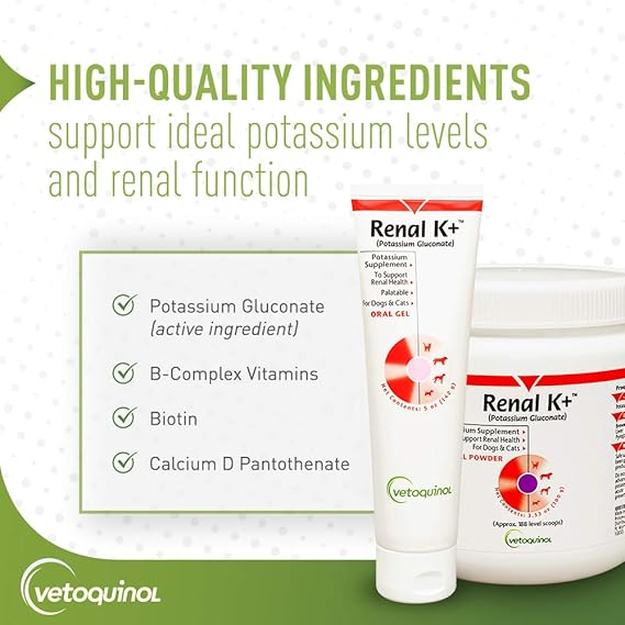 - Our potassium gluconate supplement is highly palatable & supports normal renal health in dogs & cats