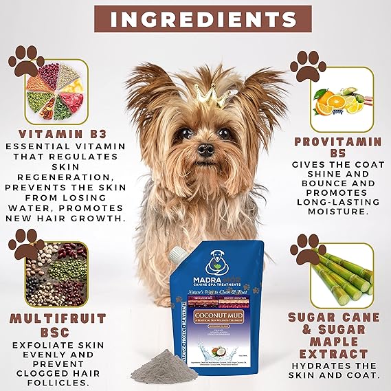 Introducing the Revitalizing Shed Safely Bath Spa Bundle, which includes a 10oz Pouch and a Multi-Purpose Keychain. Madra Mor Shed Safely is a canine skin and coat cleanser made from all-natural ingredients. This skin and coat supplement mud for dogs comes in a convenient 10oz pouch. It offers the same benefits as senior dog supplements, working to nourish weak, aging, and tired skin, ultimately restoring their coat to its former glory. The mixture of nutrient-rich components like mineral mud, seaweed kelp, aloe, grape seed oil, and omega essential oils serves to feed the skin while providing a thorough cleanse and exfoliation. Why Choose Mud For Bathing Your Best Furry Friend? Skin issues can be uncomfortable for your furry companion and impact their overall well-being. Comparable to senior dog vitamins, the Madra Mor canine spa treatment aims to safeguard your cherished pet's skin, helping to prevent such issues. It's a must-have addition to your dog supplies and pet products, delivering robust relief from dog itch, allergy support, and relief from itchy skin. The dog dry skin treatment hydrates the skin and coat for dogs, restoring nutrients and strengthening your dog's first line of defense! When massaging the hot spot treatment for dogs into their skin, your dog will relish the soothing sensation. This skin soother absorbs into their skin, providing pain relief and an instant halt to itching. They'll experience a cooling effect from the dog anti-itch mud bath. Complementary to dog vitamins and supplements, this treatment assists in detoxification. Incorporate it into your dog's body skincare routine to cleanse, protect, and rejuvenate their fur. Healthy skin leads to a magnificent coat. Our creation harnesses the power of "Mother Nature's" finest, time-tested ingredients, providing a natural and effective cleansing and treatment solution.