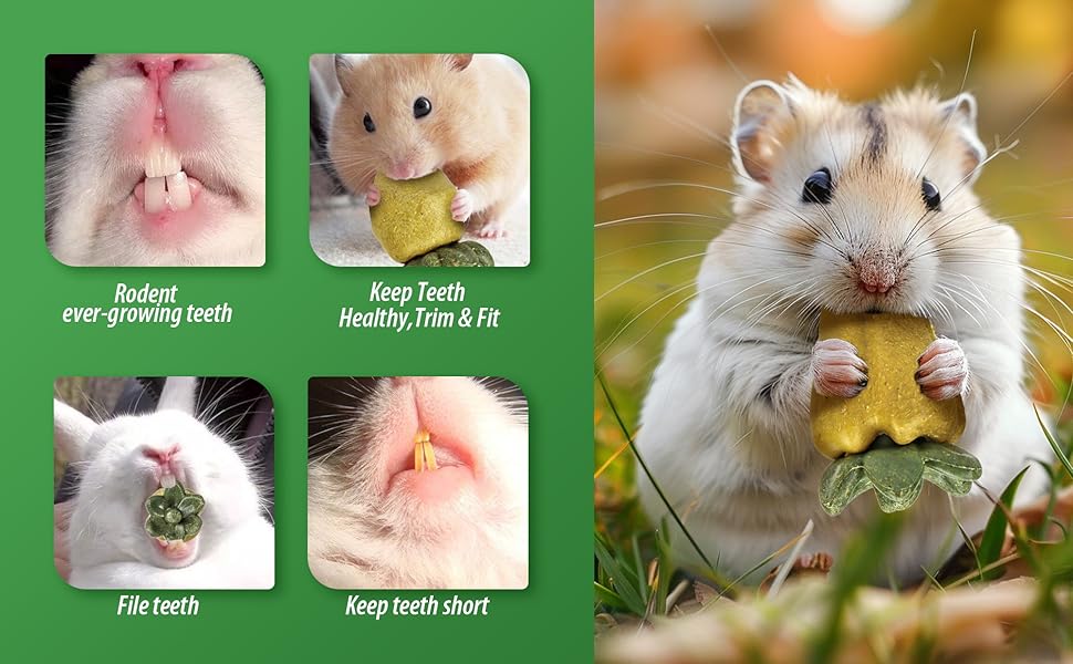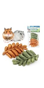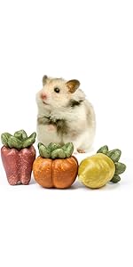 - [ Natural Materials ] : Our hamster toys are made of natural materials such as timothy grass, carrot and apple with various flavors, which can attract pets to chew and grind their teeth better, effectively exercise pets' chewing muscles