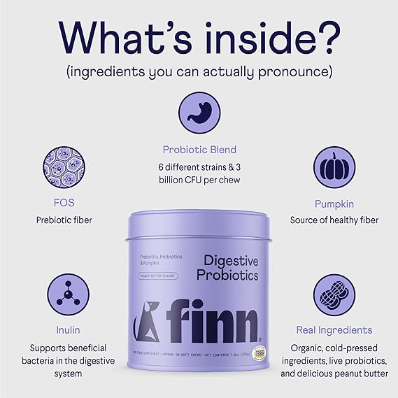 Finn Digestive Probiotics for Dogs - Complete Digestive System Support with Pumpkin, Prebiotics, & Live Probiotics - Vet Recommended & Made in The USA - 90 Soft Chews (Peanut Butter)