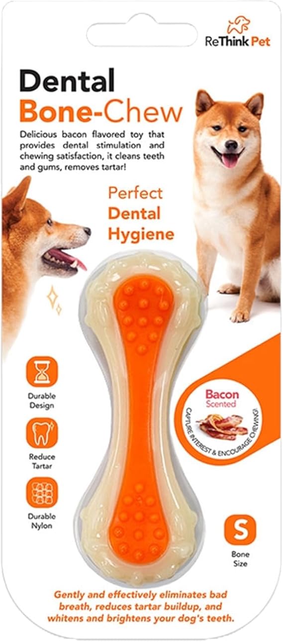 Dental Bone Chew Pet Toy Small, Bacon Scented and Flavored Dog Chew Toys, Orange