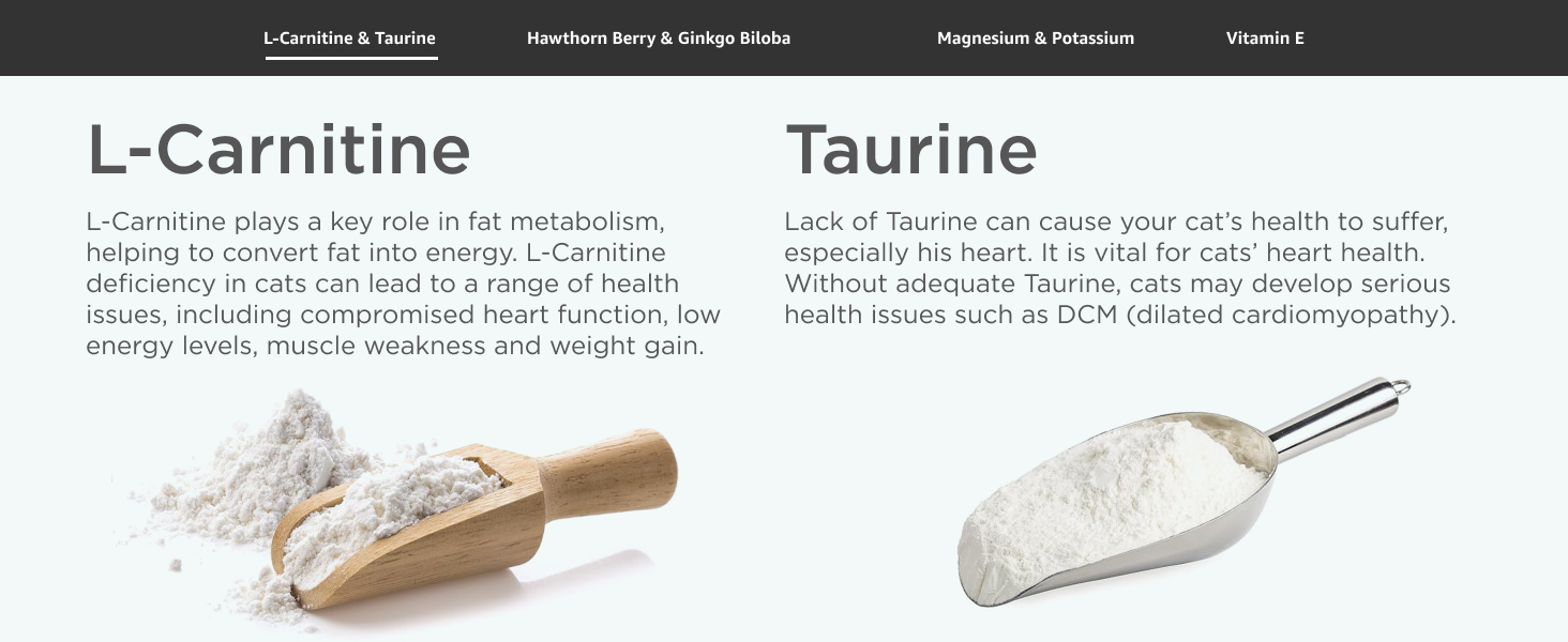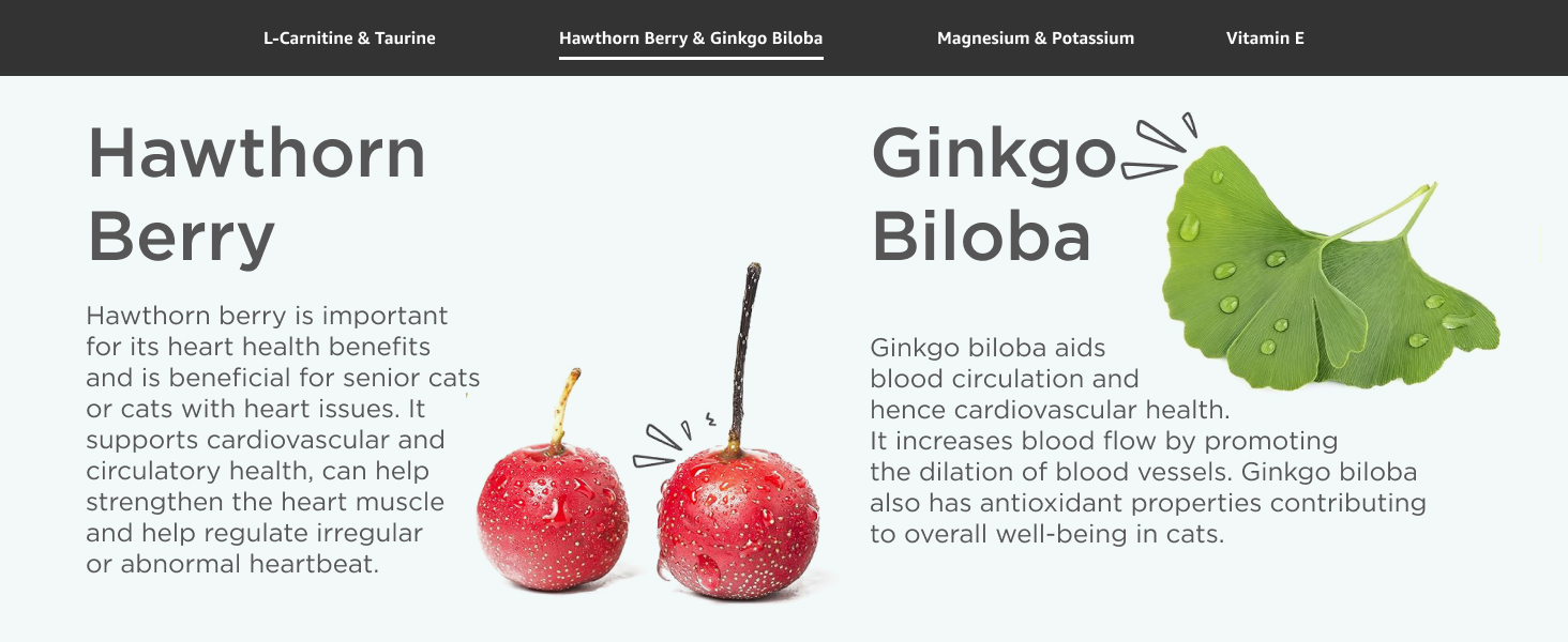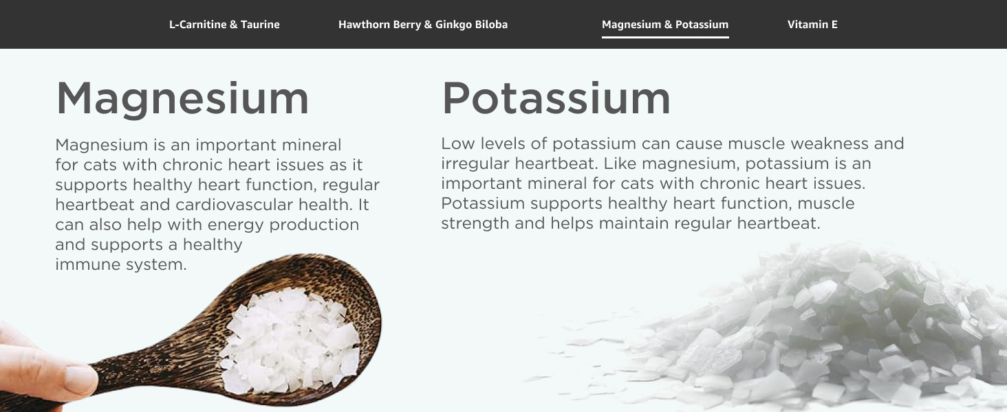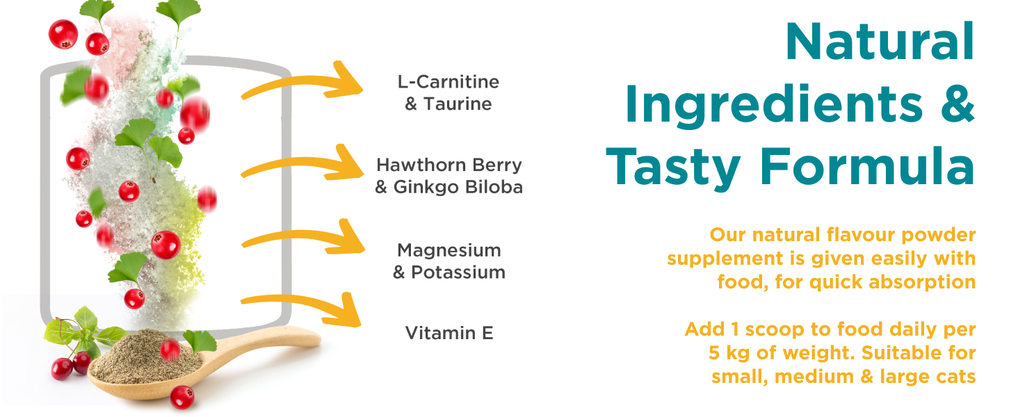 - NATURAL INGREDIENTS: L-Carnitine may help support stamina & focus; Taurine deficiency can impact your pet's heart health; Hawthorn Berry is suggested for heart issues; Ginkgo Biloba can help blood circulation; Magnesium & Potassium are helpful minerals for cats with heart conditions.