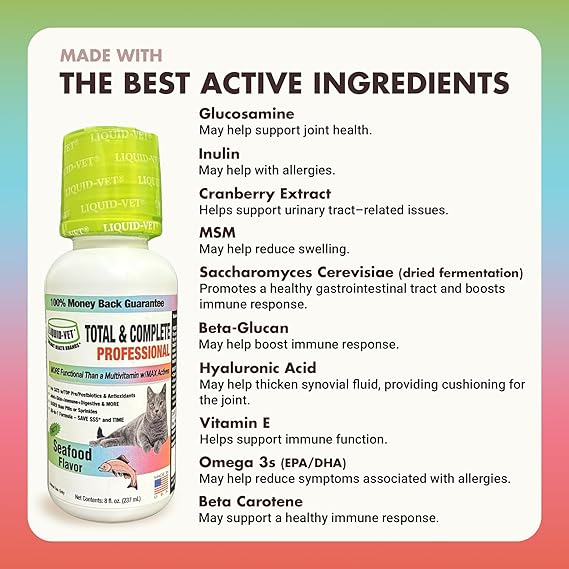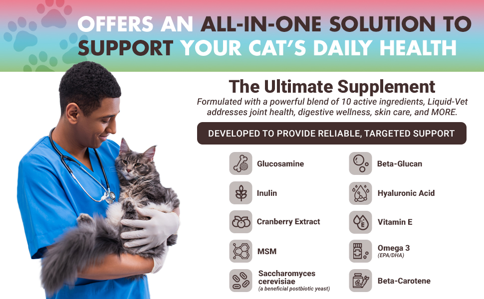LIQUID-VET Premium 10-in-1 Cat Wellness Multi-Supplement: Glucosamine, Cranberry Extract, Prebiotics, for Cats - Ultimate Feline Joint, Urinary, Skin, Immune, Digestive Formula Specifically for Cats