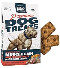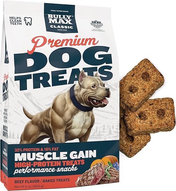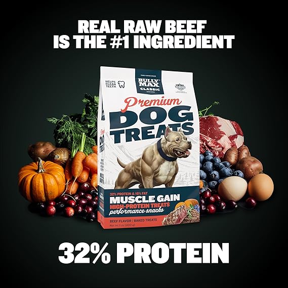 - PROTEIN-RICH TREATS FOR MUSCLE & VITALITY: Bully Max High Protein Dog Treats, with 32% protein from real beef, support muscle health and vitality in dogs. Ideal for all dog breeds, these treats are nutrient-rich, including vital ingredients from fruits, vegetables, and added nutrients. Perfect as training treats or daily nourishment, they promote a healthy, active lifestyle for your canine companion, making them an excellent choice for puppies and adult dogs alike.