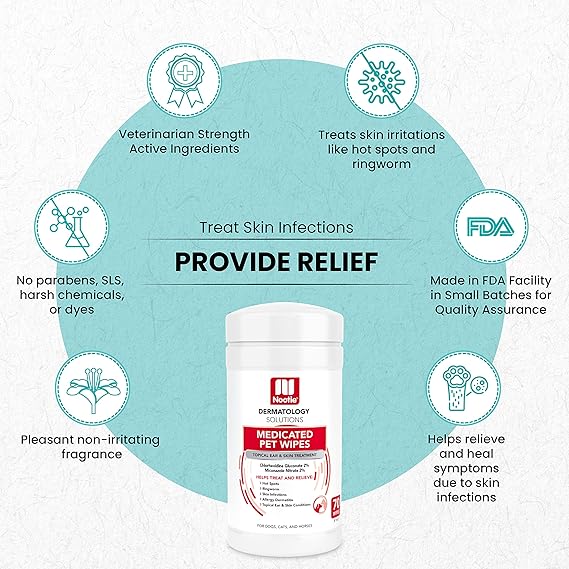 Nootie Medicated Pet Wipes - These medicated XL wipes for dogs and cats are ideal for treating symptoms of ringworm, hotspots, allergy dermatitis, and ear and skin infections. These medicated cat and dog wipes contain the following ingredients: Active Ingredients: Chlorhexidine Gluconate 2% and Miconazole Nitrate 2%; Inactive Ingredients: Purified Water, Propylene Glycol, Peg 5 Cocamide, Polyethylene Glycol 600, Benzyl Alcohol, and Fragrance. Our pet wipes are 5" x 6" in size and come in a pack of 70. The wipes are free of parabens, SLS, harsh chemicals, or dyes. Sold in over 10,000 Vet Clinics & Pet Stores Worldwide.