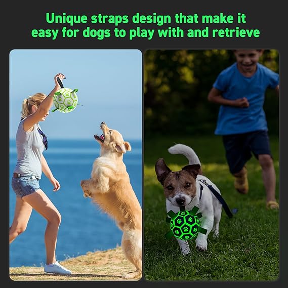 - [ Upgrade Outdoor Dog Toys] Dog soccer ball with nylon straps sewn evenly into the seams not only create an erratic bounce that dogs love to chase, but also make it easier for the dogs to fetch, toss, tug and retrieve. Dog paws are printed evenly on the dog toys ball to attract dog's attention. There's a longer strap for people to hold onto the ball, making it a great interactive dog toy to train your dogs