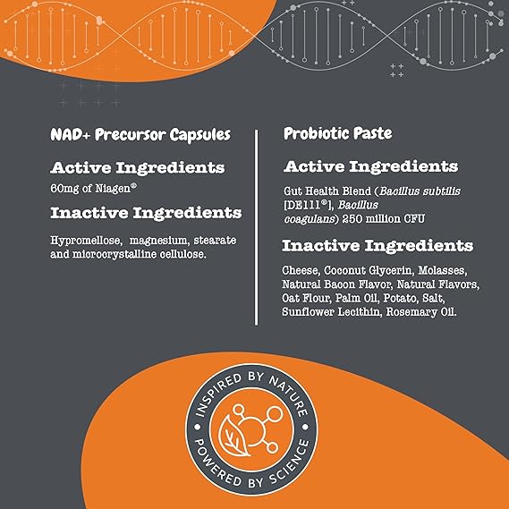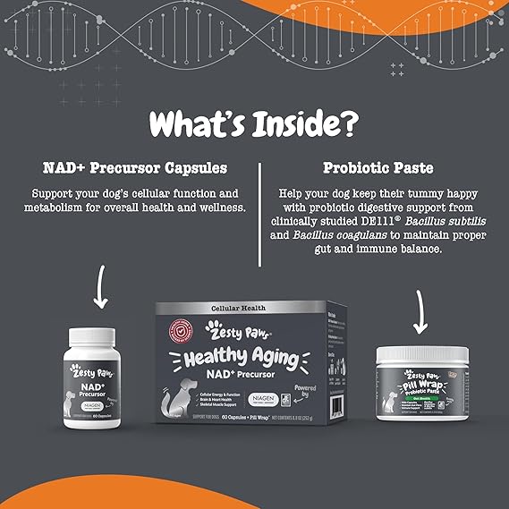- Healthy Aging, Zesty Life! - Zesty Paws NAD+ Precursor Supplement is an easy-to-use powder that includes 60 mg of Niagen per sachet to support your dog's health as they age.