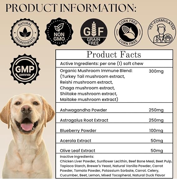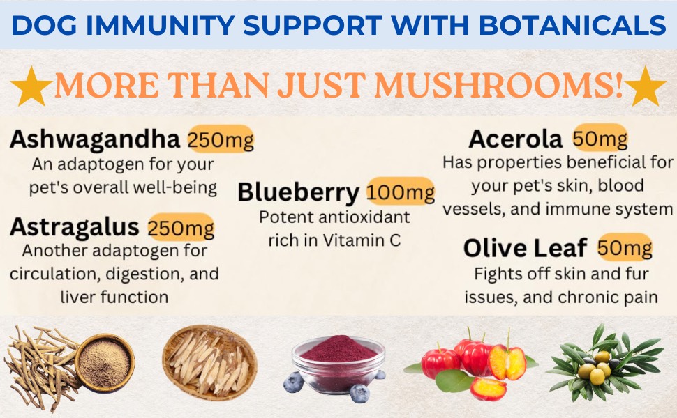- VET FORMULATED - Our mushroom dog chews are an expertly-crafted blend of real mushrooms, ashwagandha, blueberry powder, astragalus root, acerola, and olive leaf extract