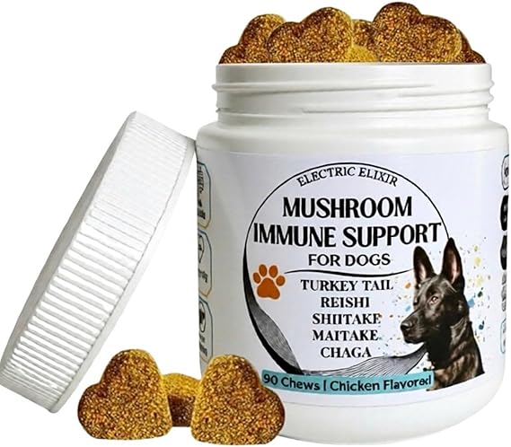 Dogs Immune Support Mushroom Supplement - Supports Longevity, Cognition, Joint, Cellular & Gut Health - All Natural Organic, GrainFree - Aid for Lumps and Bumps, Chicken Flavor - 90 Chews
