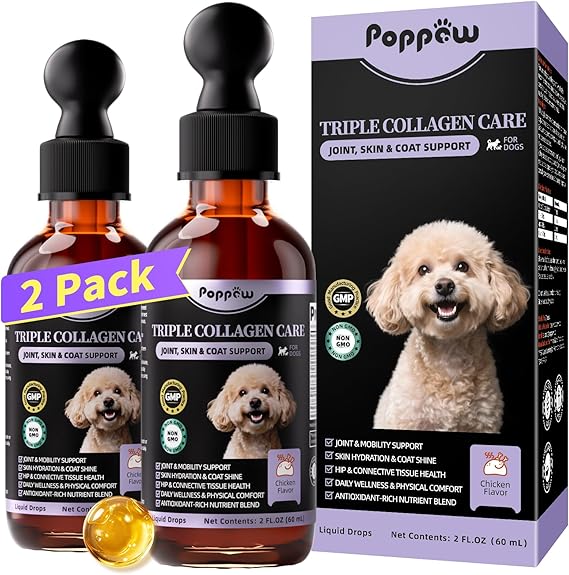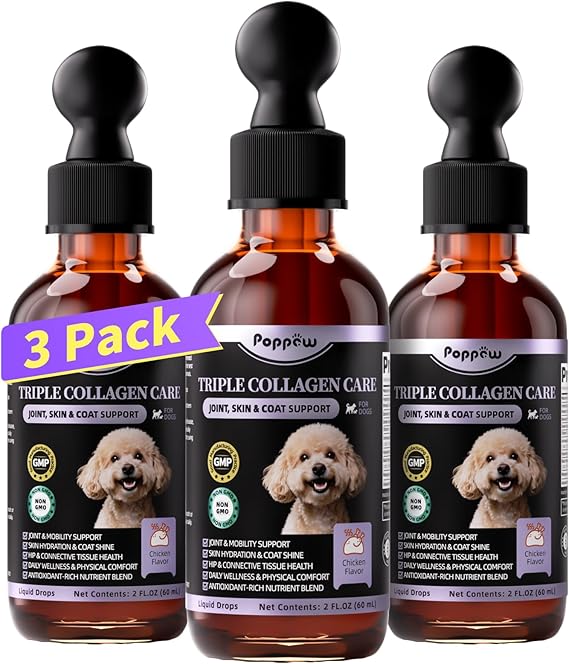 - TRIPLE LIQUID COLLAGEN FOR DOGS:This premium Collagen for Dogs formula features a powerful triple-blend of Marine, Chicken Cartilage, and Bovine collagen peptides. Delivering 250mg of targeted support per serving, it provides a comprehensive solution for your dog's robust joint, skin and coat health.