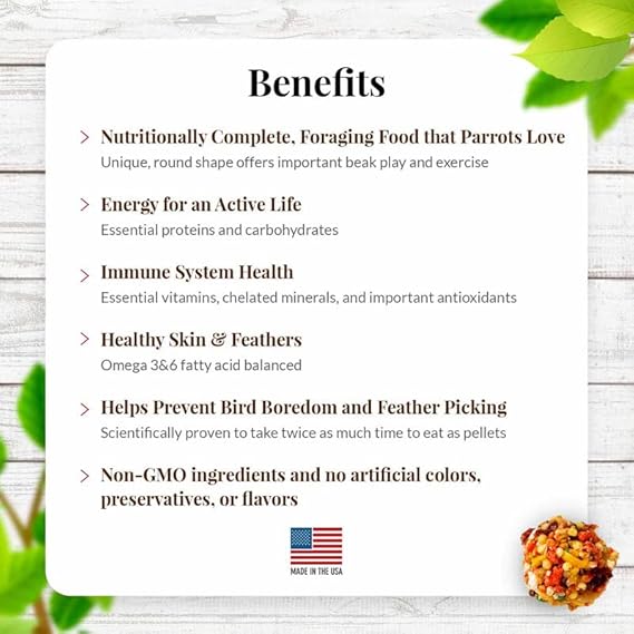 - NUTRITIONALLY COMPLETE FORAGING PARROT FOOD: formulated by top avian veterinarians and avian nutritionists; twice the foraging of pellets and the same complete nutrition