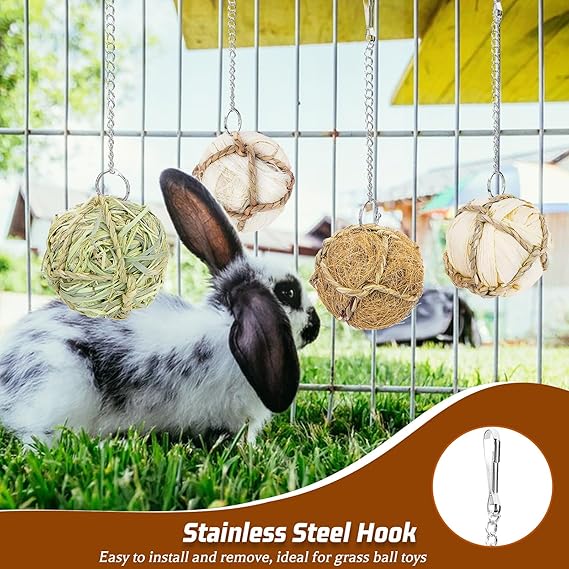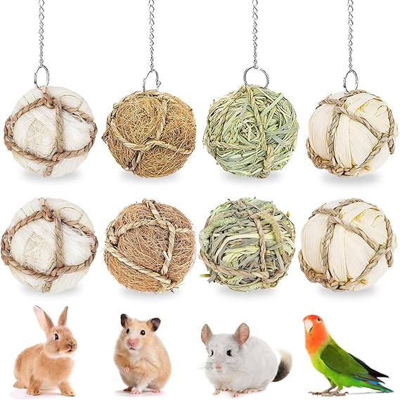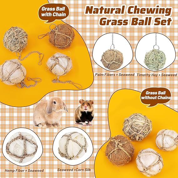 - 【What You Get】This rabbit chew toy set includes 4 different types of grass balls, with 2 of each variety: seaweed + corn silk balls, skinless rattan + seaweed balls, palm fiber + seaweed balls, and hemp fiber + seaweed balls. Perfect not only for rabbits but also for chinchillas, hamsters, gerbils, birds, and other small pets