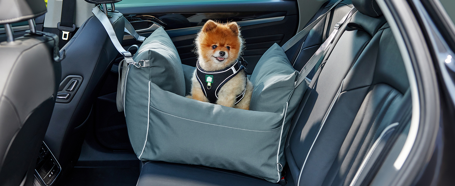 Dog Car Seat for Small to Medium Dogs - Waterproof Pet Booster Seat for Car with Clip-On Safety Leash, Travel Carrier for Puppy up to 25 lbs, Memory Foam Filling & Adjustable Buckles, Grey