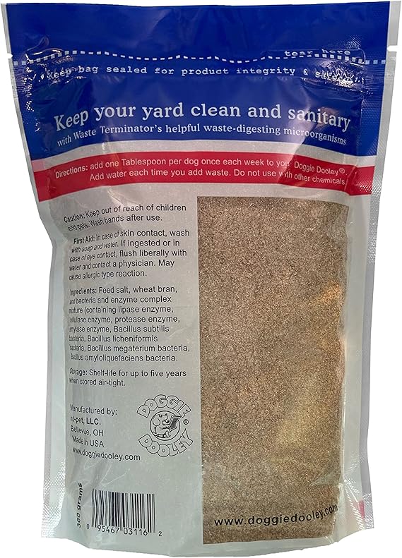 360 grams of the Waste Terminator packaged in a handy re-sealable plastic tub. Our premium Digester Powder, contains twice the amount of enzymes and bacteria per scoop compared to our regular brand. Works will with larger breeds or for homes with multiple dogs. Harmless, non-toxic, helps control pet waste odors. Contains 52 tablespoons, about a one year supply.