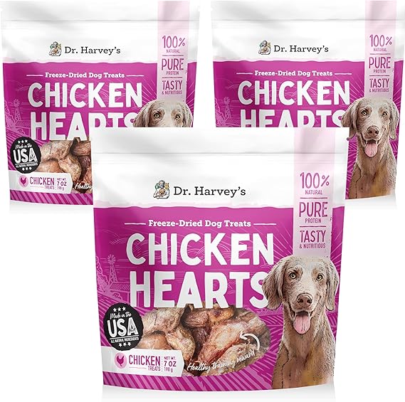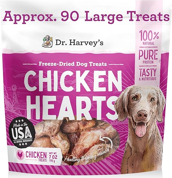 - Pure Natural Chicken Hearts - Dr. Harvey's Freeze-Dried Chicken Hearts is pure chicken with no additives, fillers, or preservatives. It's 100% natural protein. Just what dogs need for good health, faster healing, and lots of tail wagging energy. Essential for both girls and boys at all ages.