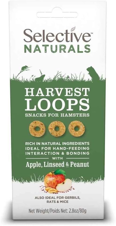 Science Selective is the widest range of veterinary recommended species-specific foods formulated to meet the nutritional needs of small furry pets. Now treating small pets can be healthy as well as delicious too, with Selective Naturals. These Harvest Loops with Apple, Peanut and Linseed are tasty baked treats made fresh from our bakery in the heart of Suffolk and with no added sugar or artificial colours - ideal for small pet omnivores.