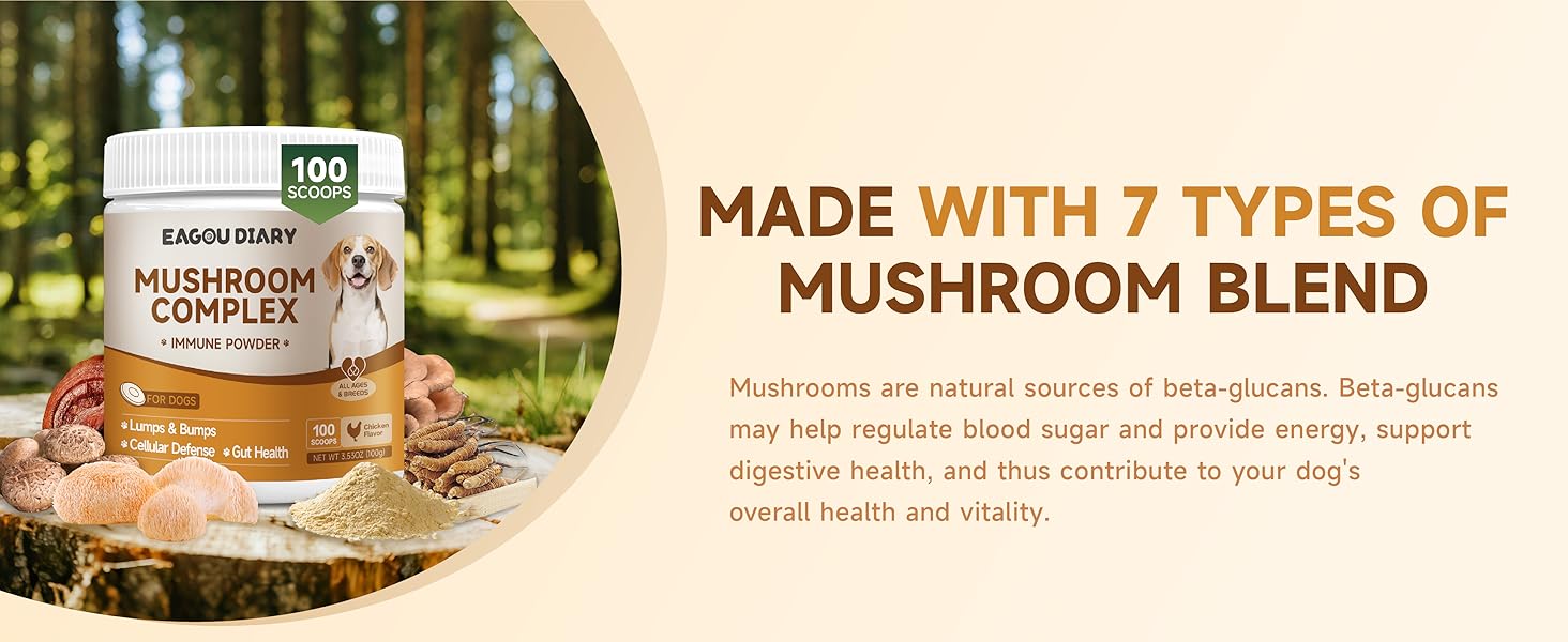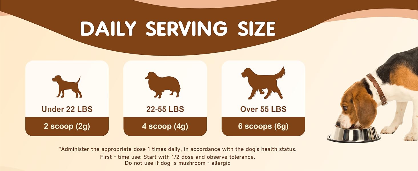 - Easy to Use : Incorporating this mushroom powder for dogs into your dog's diet is simple. Just sprinkle our dog mushroom powder onto your pet's food. For dogs under 22 pounds, use 2 scoops; for dogs between 22 - 55 pounds, 4 scoops are recommended; and for dogs over 55 pounds, 6 scoops will suffice