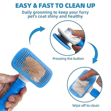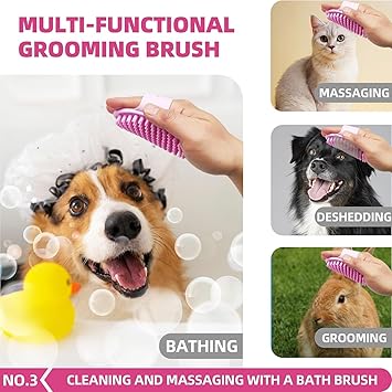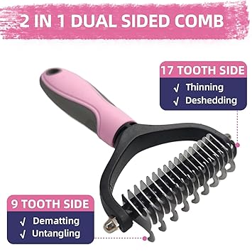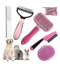- A variety of different de-shedding tools:1. dog cat self-cleaning grooming brush can easily for pets shedding effortless; 2. double-sided de-shedding rake to remove the undercoat of the dog and cat, to reduce hair loss; 3. bathing brush to thoroughly clean and massage every inch of the pet's hair ;4. coarse and fine tooth row comb for pet grooming styling, to remove the undercoat knotted tangled ;5. flea comb to remove fleas