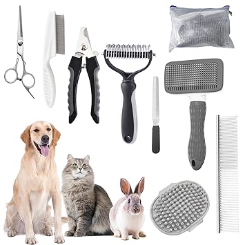 - All-In-One 9-Piece Set:complete set of cat rabbit dog grooming brushes for grooming, all the essentials in one easy-to-find, easy-to-carry bag;Includes all the tools needed for your pet's daily care shedding with a self-cleaning brush, double-sided deshedding rake,bathing brush,coarse and fine-toothed rows of combs, flea comb,dog grooming scissor, dog nail clippers and sharpening pads;All-around care for your pet;It is a good choice for gift giving and personal use