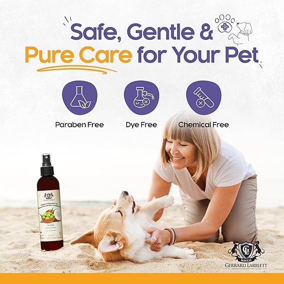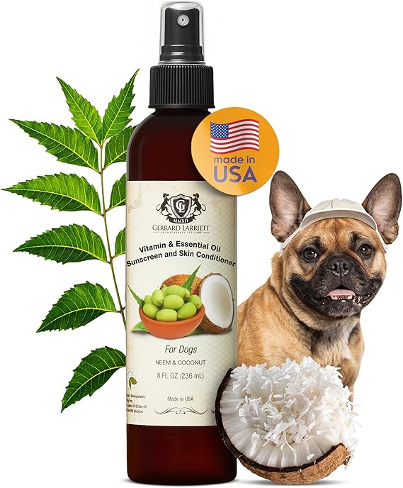 - DOG SUNSCREEN & CONDITIONER FOR OPTIMAL CARE: Our Gerrard Larriett Aromatherapy Pet Care dog sunscreen & conditioner, sun block for dogs is a beach essential, enriched with vitamins and essential oils to keep your dog’s skin and coat healthy all summer. Designed as a sunblock for dogs, it helps protect against sunburn and dryness. This sunscreen for dogs is a must-have, providing reliable protection and nourishment for your pup.