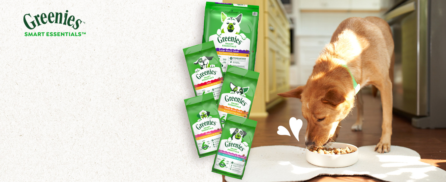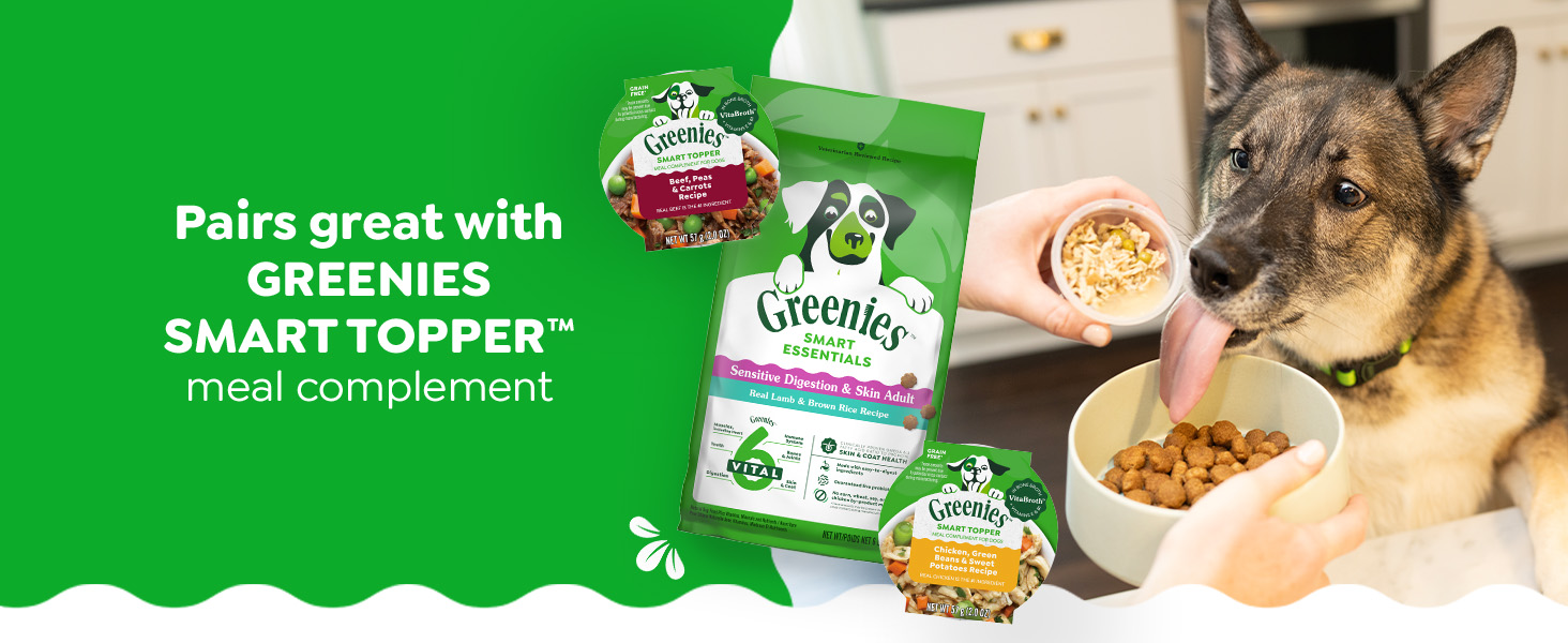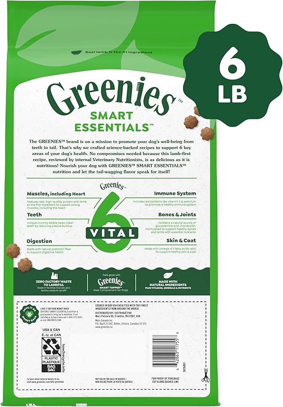 The Greenies brand is on a mission to promote your dog’s well-being from teeth to tail! Greenies Smart Essentials Sensitive Digestion & Skin Adult Dry Dog Food Real Lamb & Brown Rice Recipe offers science-backed nutrition with an irresistible taste. This nutritious dog food recipe features real lamb as the #1 ingredient and is designed to help support 6 key areas of your dog’s health: digestion, immune system, teeth, skin & coat, bones & joints, and muscles, including the heart. Greenies Smart Essentials Sensitive Digestion & Skin Adult Dry Dog Food is formulated without corn, wheat, soy, or chicken by-product meal and no artificial flavors or fillers*. Made with natural ingredients plus vitamins, minerals, and nutrients, Greenies Smart Essentials Sensitive Digestion & Skin Adult Dry Dog Food is guaranteed to bring joy to mealtime with tail-wagging flavor. Love it or your money back! *Trace amounts may be present due to potential cross-contact during manufacturing