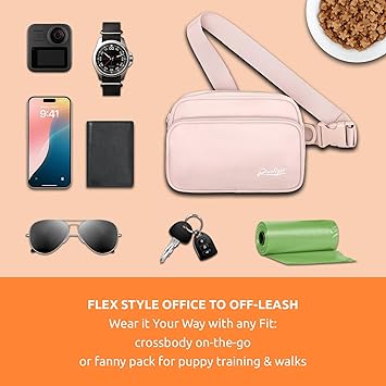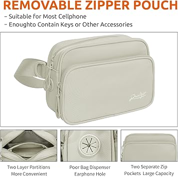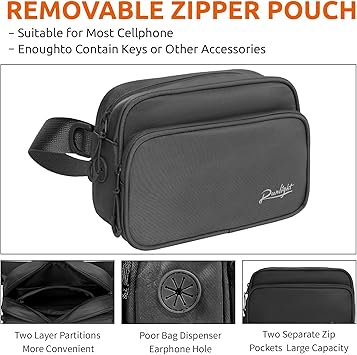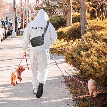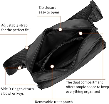 This is the perfect treat pouch for any pet occasion!The fabric is durable and the material is easy to wipe clean.There are two separate zip pockets.Two D-rings buckles on the side (can be used to hang dog bowl or dog leash).The versatility of the adjustable strap.It easily transforms the bag from a sleek cross-body to a trendy fanny pack,adapting to your style and needs.Removable & Washable Treat Pouch:The velcro-secured treat pouch is a game-changer.It’s so easy to remove and clean,and no crumbs are left behind!Poop Bag Dispenser:Never be caught without a poop bag again! Our discrete poop bag dispenser allows for quicker pick ups.This feature is both stylish and practical.It dispenses poop bags discreetly,making it convenient and hassle-free.The dual compartment offers ample space to keep everything organized—treats,wallet,phone and more.It’s incredibly convenient and keeps everything in its rightful place.This pet accessory bag is a perfect blend of style and functionality.It has made your walks with your dog so much easier and more enjoyable.Big Enough forEveryday Use.Highly recommend it to all dog parents!