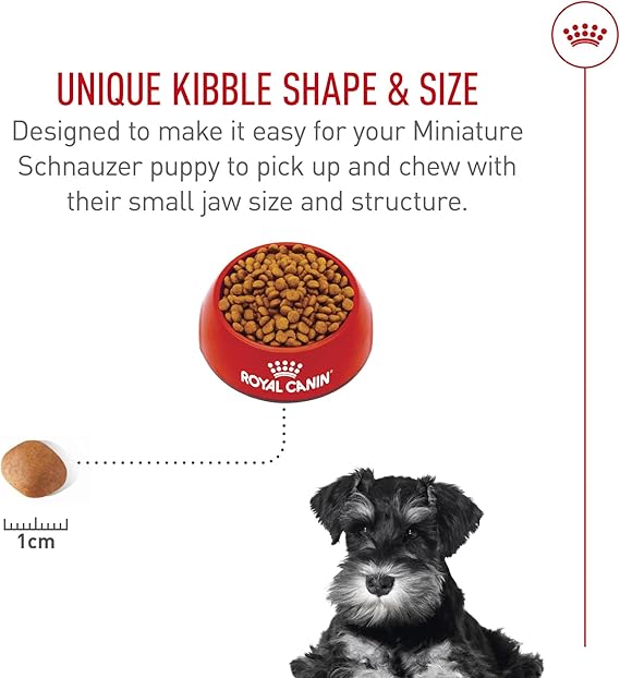Royal Canin knows what makes your Miniature Schnauzer puppy magnificent is in the details. With their little scruffy faces and button noses, Mini Schnauzer puppies are beloved family dogs ready to please and play all day. They can benefit from the right growth formula for immune system support, weight management, and digestive care as they take on puppyhood. Royal Canin Miniature Schnauzer Puppy Dry Dog Food is tailor-made nutrition created just for your Schnauzer pure breed puppy. This exclusive breed-specific diet is uniquely formulated for your Mini Schnauzer puppy, with the specific nutrients to help puppies thrive. The specialized kibble is designed for your small breed’s moderately blunt muzzle and scissor bite, making it easy for small dogs to pick up and chew. An exclusive mix of antioxidants and vitamin E supports healthy development of their immune systems and keeps young dog bodies growing strong. High-quality proteins and prebiotics promote healthy digestion and optimal stool quality. And precise nutrients, moderate fat levels, and added L-carnitine help keep your puppy at an ideal weight as they grow. Once your small breed Miniature Schnauzer puppy is over 10 months old, transition them from puppy dog food to Royal Canin Miniature Schnauzer Adult Dog Food for precise nutrition into the adult years. With over 50 years of scientific research and observation, Royal Canin continues to deliver targeted nutrition to feed every pet’s magnificence. Not satisfied? Then neither are we. Our breed health formulas are 100% satisfaction guaranteed.