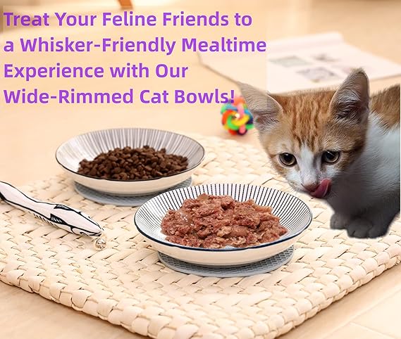 - CAT BOWLS WHISKER FRIENDLY: The cute cat bowls size is 5.5" and the depth is 1.2"; This cat food bowls' wide opening and shallow depth are intended to keep your cat's whiskers safe and make mealtime more pleasant