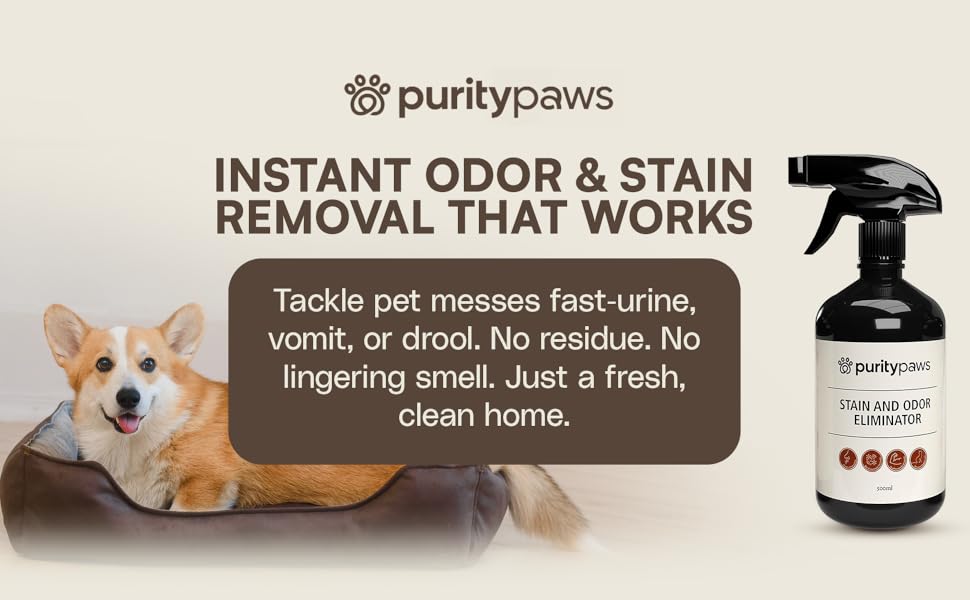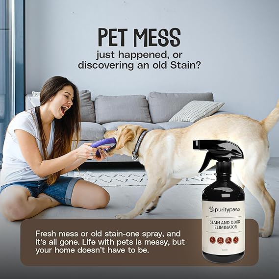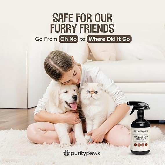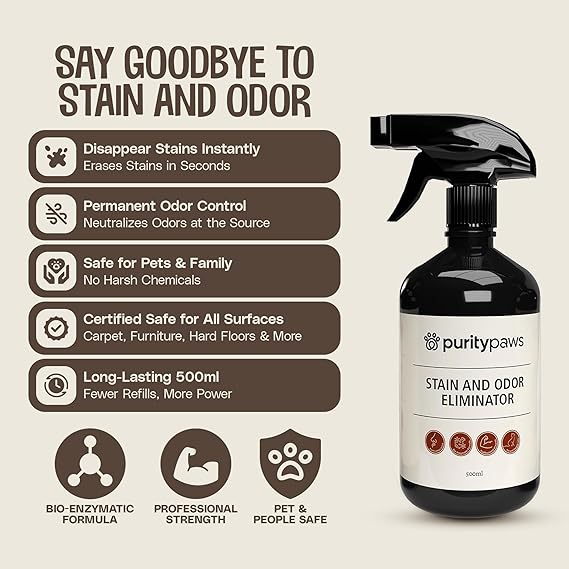- POWERFUL ENZYMATIC CLEANER: Purity Paws odor eliminator targets stubborn pet stains and odors from dog and cat urine, feces, vomit, and more. Safe for carpets, upholstery, mattresses, tiles, and hardwood. Quickly dissolves messes at the source, leaving surfaces fresh, clean, and residue-free.