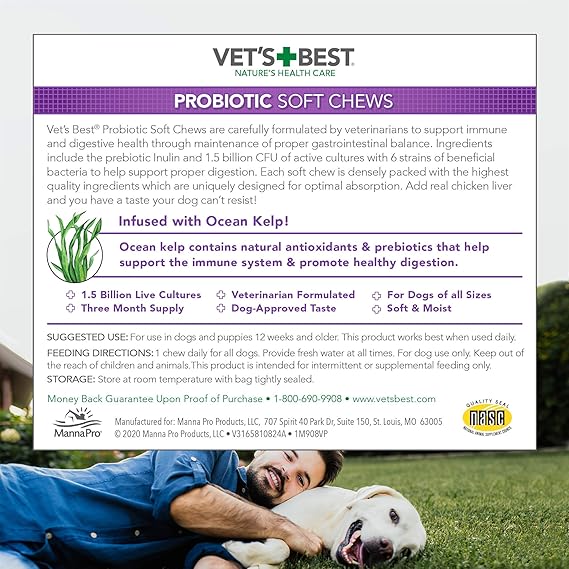 Support your dog’s digestive wellness and overall gut health with Vet’s Best Probiotic Soft Chews Dog Supplement, a veterinarian-formulated daily supplement designed to promote optimal digestive balance and immune system support. Each soft chew contains a powerful blend of natural prebiotics and probiotics, including five strains of beneficial bacteria and more than 1.5 billion CFU per chew, making it ideal for dogs experiencing occasional digestive upset, bloating, gas, or irregularity. These tasty, chicken-flavored chews are soft, easy to feed, and suitable for all dog breeds and sizes. Whether you’re helping your pup transition to a new food, recover from antibiotics, or simply maintain a healthy digestive tract, Vet’s Best offers a gentle, effective solution. Made in the USA with high-quality ingredients, this 90-day supply ensures consistent daily care with no artificial flavors, colors, or preservatives. Ideal for pet owners seeking a natural probiotic for dogs, Vet’s Best is your trusted partner in maintaining gut flora balance, supporting nutrient absorption, and promoting overall canine vitality. Add Vet’s Best Probiotic Soft Chews to your dog’s routine for tail-wagging health from the inside out.
