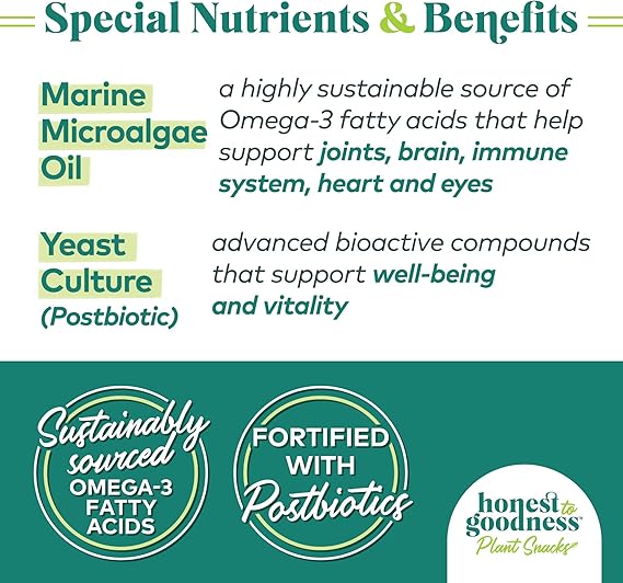 - SPECIAL NUTRIENTS - Our snacks are also infused with Marine Microalgae Oil, a highly sustainable source of Omega 3s, and Yeast Culture (Postbiotic), which contains advanced bioactive compounds that support well-being and vitality.