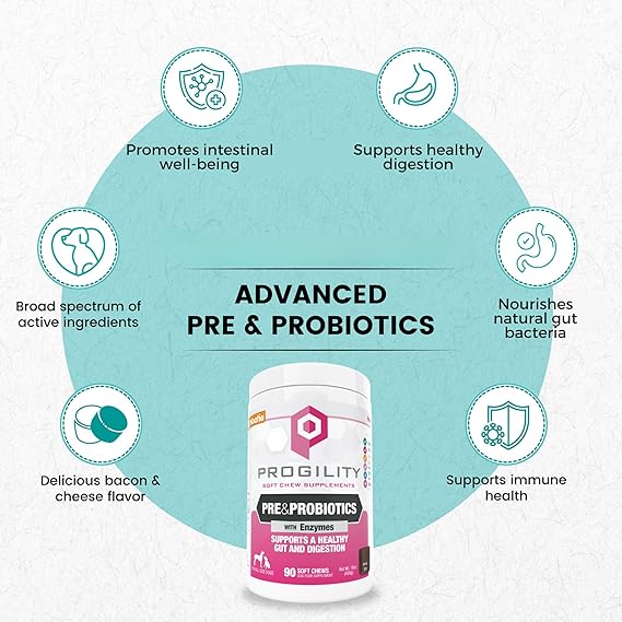 Help support healthy digestion for sensitive stomachs with Progility Mini Pre & Probiotic Supplement! This digestive aid helps maintain a healthy gut and bowels with prebiotics, probiotics, and enzymes. This dog probiotic supplement is great for managing your dog's sensitive stomach by aiding in digestion and nutrient breakdown. Each delicious soft chew is formulated with a broad spectrum of active ingredients, including Pumpkin and Chicory Root, Protease, Lipase, Amylase, and Saccharomyces Cerevisae, to help support your dog's immune health and gastrointestinal tract.