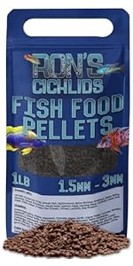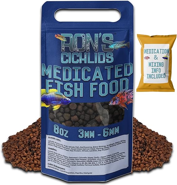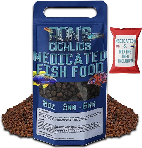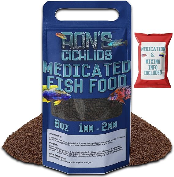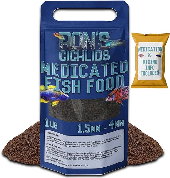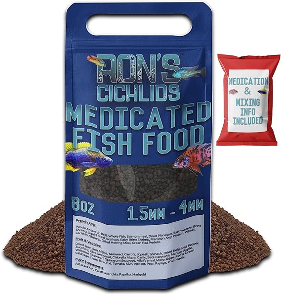 - Targeted Health with Medication: Discover Ron's Medicated Adult Cichlid Fish Food, a precision-crafted blend designed to provide specialized care for adult cichlids, including the remarkable Mbuna species, with added medication support.