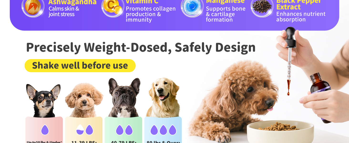 - EASY-TO-USE & PALATABLE LIQUID DROPS:Our liquid Collagen Dogs supplement is effortlessly administered by mixing into food. The chicken flavor ensures even the pickiest eaters will easily enjoy their daily dose.