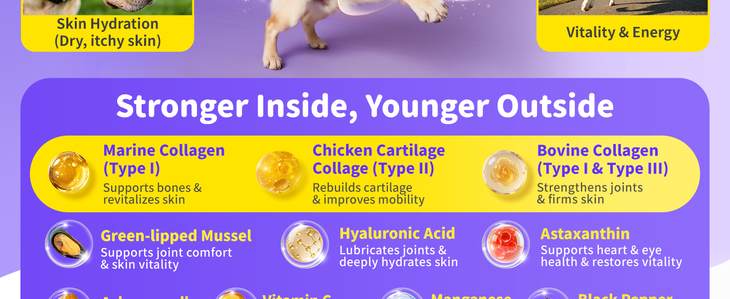 - ADVANCED HIP & JOINT SUPPORT:Specifically designed to promote joint wellness in "Collagen Dogs", our blend synergizes hydrolyzed collagen with Green-lipped Mussel and Hyaluronic Acid. This powerful combination helps maintain joint cushioning, promote flexibility, and support comfortable movement in active and senior dogs.