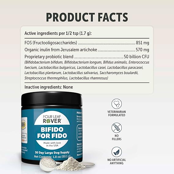 Four Leaf Rover Bifido for Fido - Dog Probiotics for Digestive Health and Gut Health and Immune Balance - 50 Billion CFU - Veterinarian Formulated - 30 Day Large Dog Supply