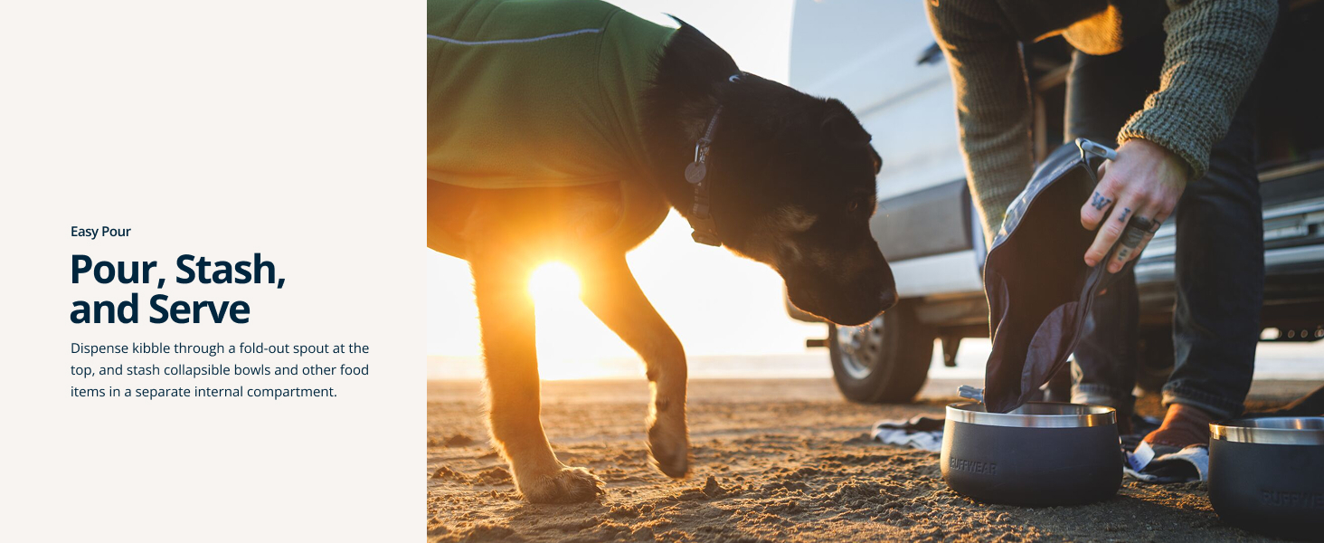 - EASY POUR, LESS MESS. Top spout lets you pour kibble straight into bowls without spills. Roll-down closure secures food and adjusts capacity, perfect for dogs, puppies, and outdoor adventures.
