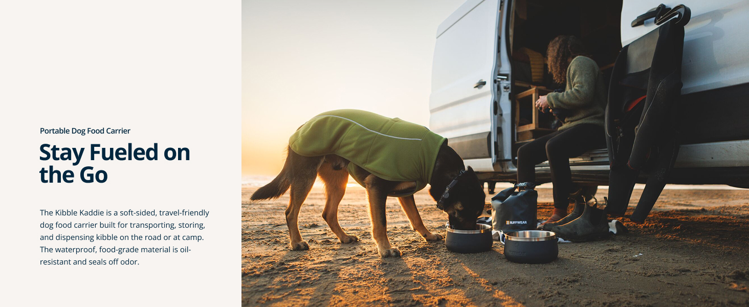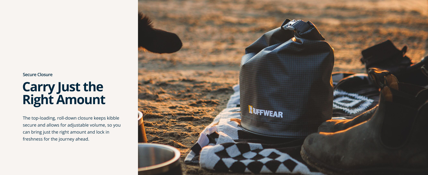 - ADVENTURE-READY FOOD BAG. Travel-friendly bag keeps kibble fresh, odor-free, and pest-free with waterproof, food-grade liner, roll-down closure, and adjustable volume for trips big or small.