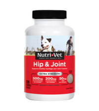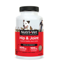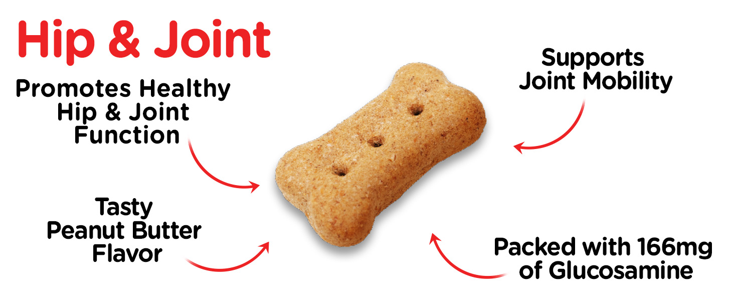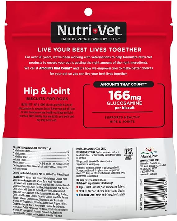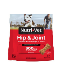 Closer to medicine than your average treat and much tastier than any pill, these yummy peanut butter-flavored biscuits help promote healthy hips and connective tissue using a proprietary blend of key nutrients. As dogs age, so do their joints, ligaments, and tendons, causing stiffness and pain and decreasing mobility. The use of glucosamine and similar agents can help prevent this process or relieve the pain thats already present. Each of Nutri-Vets Hip and Joint Formula biscuits delivers 166 milligrams of glucosamine along with support factors like trace materials and Ester-C that aid glucosamines healing action. The biscuits also contain a full complement of vitamins and minerals and meet all nutritional levels established by the Association of American Feed Control Officials (AAFCO). Theyre even hard and crunchy to help clean teeth as dogs chew and freshen breath, too.