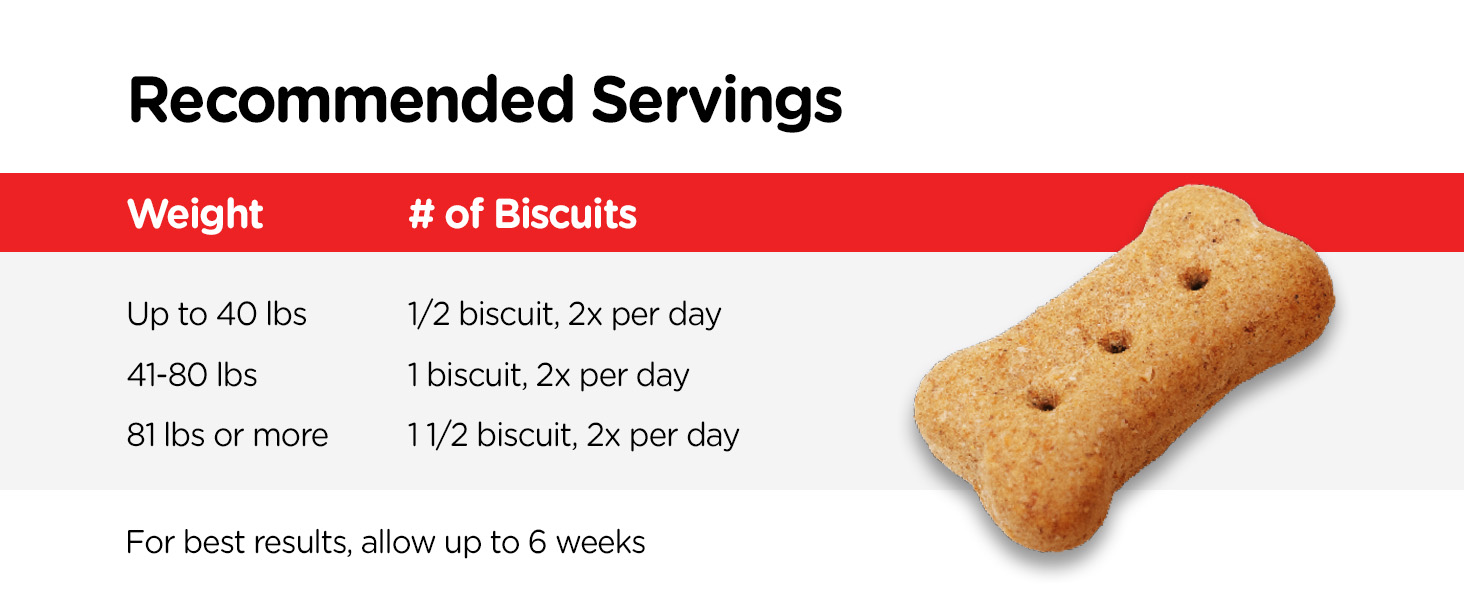 25 lbs. = 1 biscuit per day 50 lbs. = 2 biscuits per day 75 lbs. and over = 3 biscuits per day