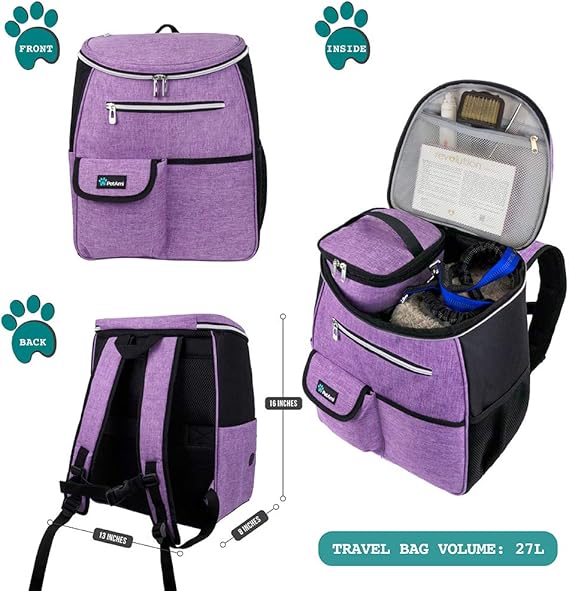 PetAmi Dog Travel Bag Backpack, Airline Approved Dog Bags for Traveling, Puppy Diaper Bag Supplies, Pet Camping Essentials Hiking Accessories Dog Mom Gift, Food Container, Collapsible Bowls, Purple