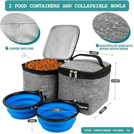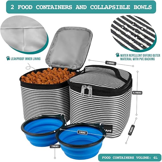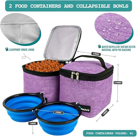 - PET SUPPLIES DOG DIAPER BAG: The dog travel backpack helps dog owners easily organize treats, kibbles, toys, leashes, and all other pet accessories and training supplies. The doggie traveling backpack comes with two food containers and two collapsible silicone dog bowls, ensuring that your pet is well-fed and hydrated during your hiking camping trip. Each food container has a 4L capacity, making it a camping gear must have for all small, medium, and large size dogs and cats.