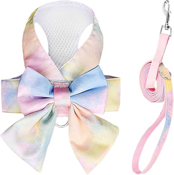 PETCARE Cute Bow Tie Dog Harness and Leash Set Elegant Rainbow Gradient Puppy Harness No Pull Soft Mesh Pet Cat Dog Vest Harnesses for Small Dogs Cats, Yellow