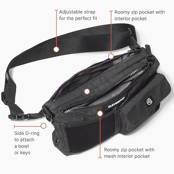 - BUILT-IN FEATURES - Includes a food-safe treat pouch, built-in squeaker for training, quick-drying ball pocket, poop bag dispenser, and two roomy zip compartments. A side d-ring lets you attach a bowl, keys, or other items. All materials are easy to clean for everyday convenience.
