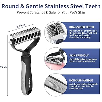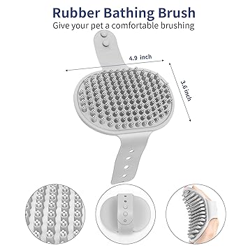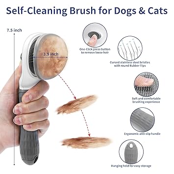 - [GENTLE & EFFECTIVE] Achieve gentle grooming and deshedding with a self cleaning slicker brush, rounded teeth rake, and comb. Soft bath head for tangle-free hair. Perfect for sensitive pets. Ergonomic design for comfort and control.
