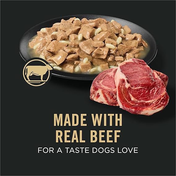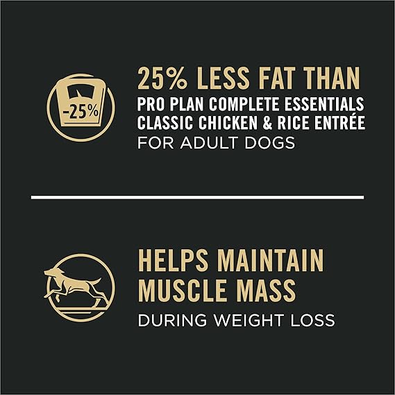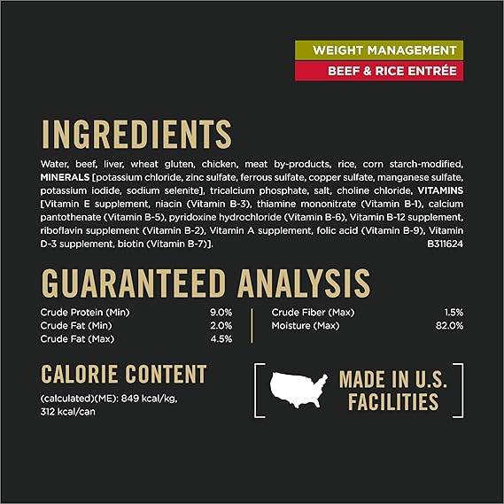 Help your dog maintain a healthy weight with Purina Pro Plan Weight Management Beef and Rice Entree in Gravy wet adult dog food. Made with real beef, for a taste dogs love, this high protein dog food helps your pal maintain muscle mass during weight loss. Every serving of this Purina Pro Plan Weight Management dog food is ideal for overweight or less active dogs with 25 percent less fat than Pro Plan Complete Essentials Classic Chicken and Rice Entree adult dog food. Plus, the weight management dog food formula helps support a healthy immune system and nourishes his healthy skin and coat. And to ensure this wet food for dogs gives your dog only what he needs and nothing he doesn’t it’s made with no artificial colors, flavors or preservatives. Help your dog achieve a healthy weight by filling his bowl with Purina Pro Plan Weight Management Beef and Rice Entree in Gravy wet adult dog food.