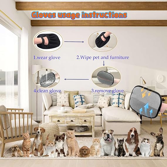 Ergonomic Five-Finger Design & Comfortable: Pet hair remover made from soft, Fits comfortably like a glove for better control and a more natural grooming experience compared to brushes or rollers.Electrostatic gloves pet hair