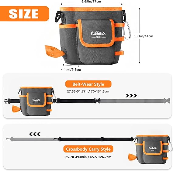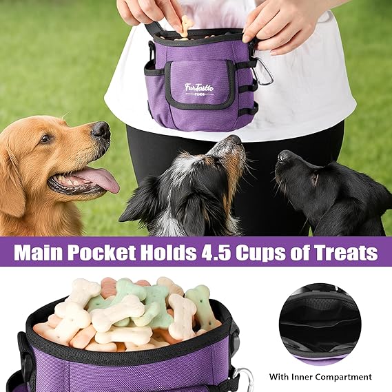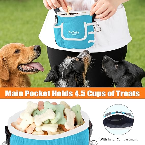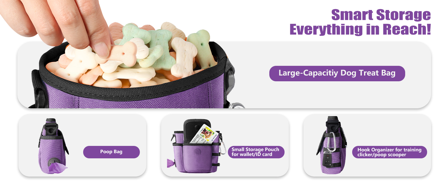 - Multi-Storage Design: The dog treat pouch holds 4.5 cups of treats in its main compartment, plus a front pocket for essentials and side for poop bags. Another side loops keep keys/training clickers handy during training or walks - all in one compact bag