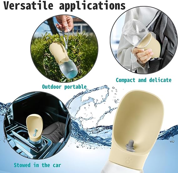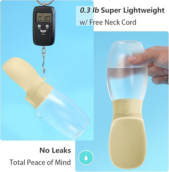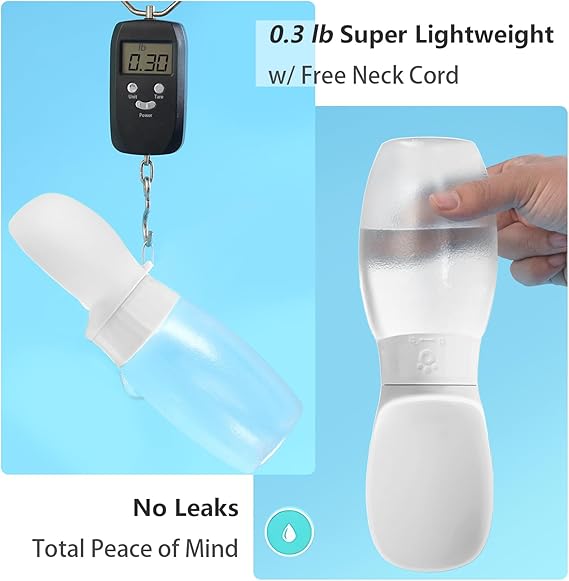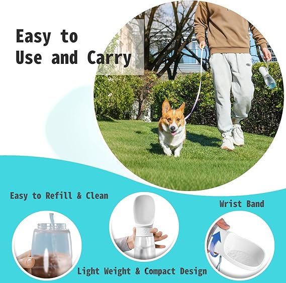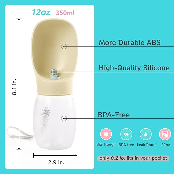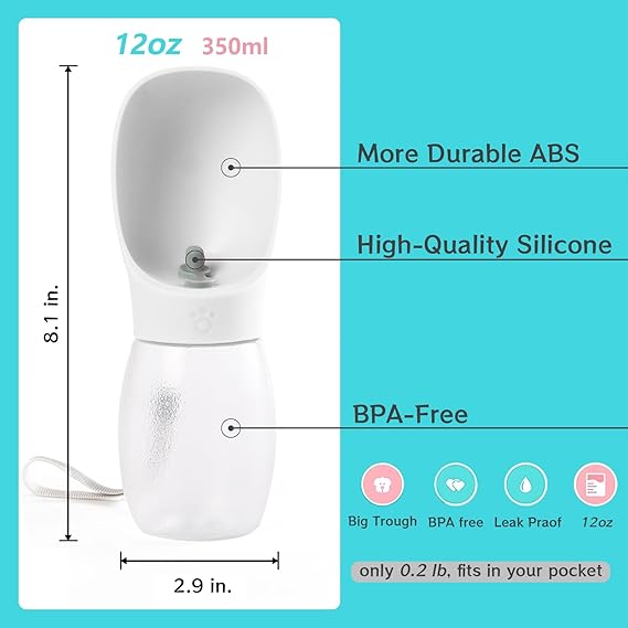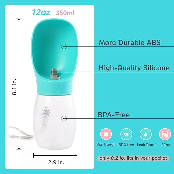 - 【CONVENIENT TO CARRY】Dog water bottle enough capacity 12 oz 350ml.capacity meets 4-hour hydration needs for medium dogs. and compact water bottle design is great for your pet dog or cat when outdoor walking, running, hiking, travelling or playing, etc. You can put it into backpack or hang on your hand with sling rope, very easy to carry to anywhere you want~